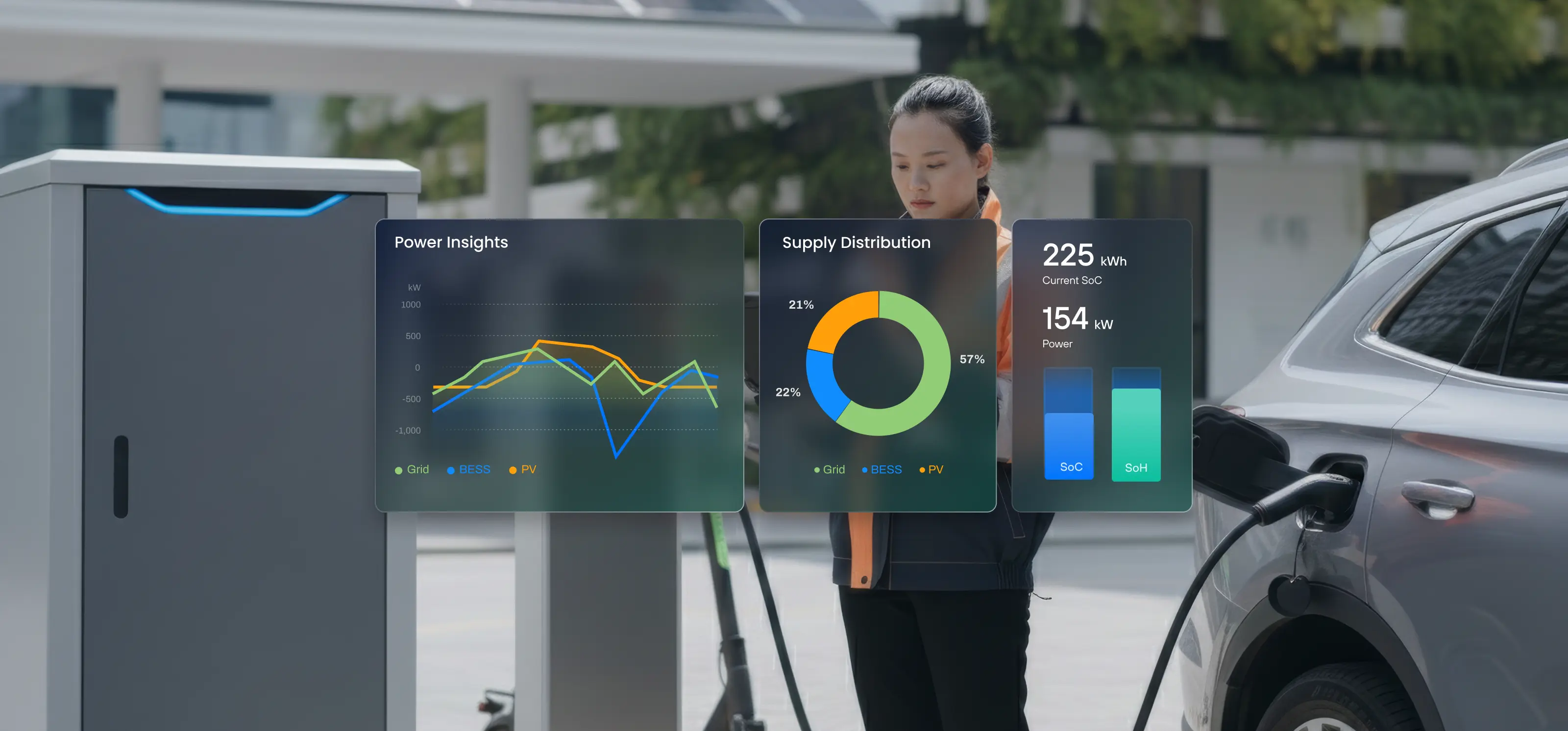 Battery-Boosted Charging Solution integrates battery storage to enhance EV charging capabilities. It uses batteries to deliver burst power, cap grid demand, and maintain service when capacity is limited. This speeds DC fast-charging deployment, reduces demand charges, and improves overall site economics.